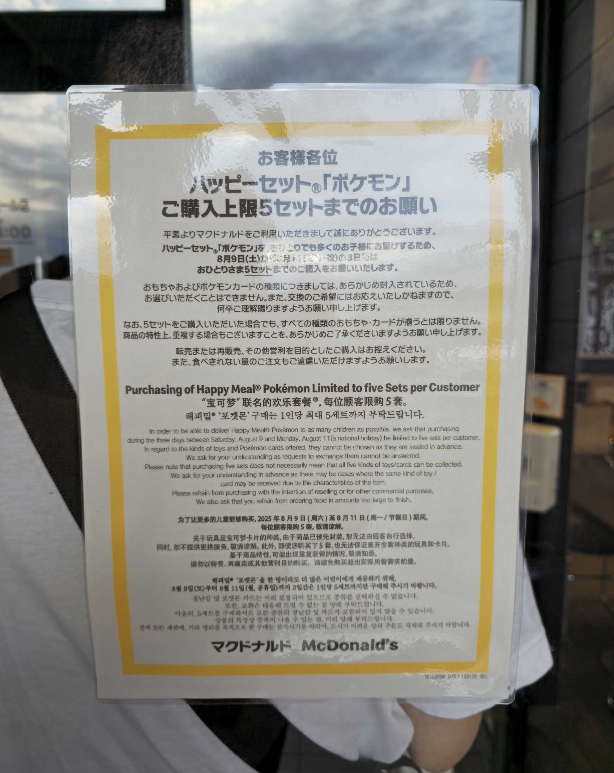 With demand sky high for the limited Pokémon toys and promo cards, McDonald’s Japan placed a limit of five sets per customer. Signs about the restriction were posted throughout the stores and translated into multiple languages to ensure everyone understood.