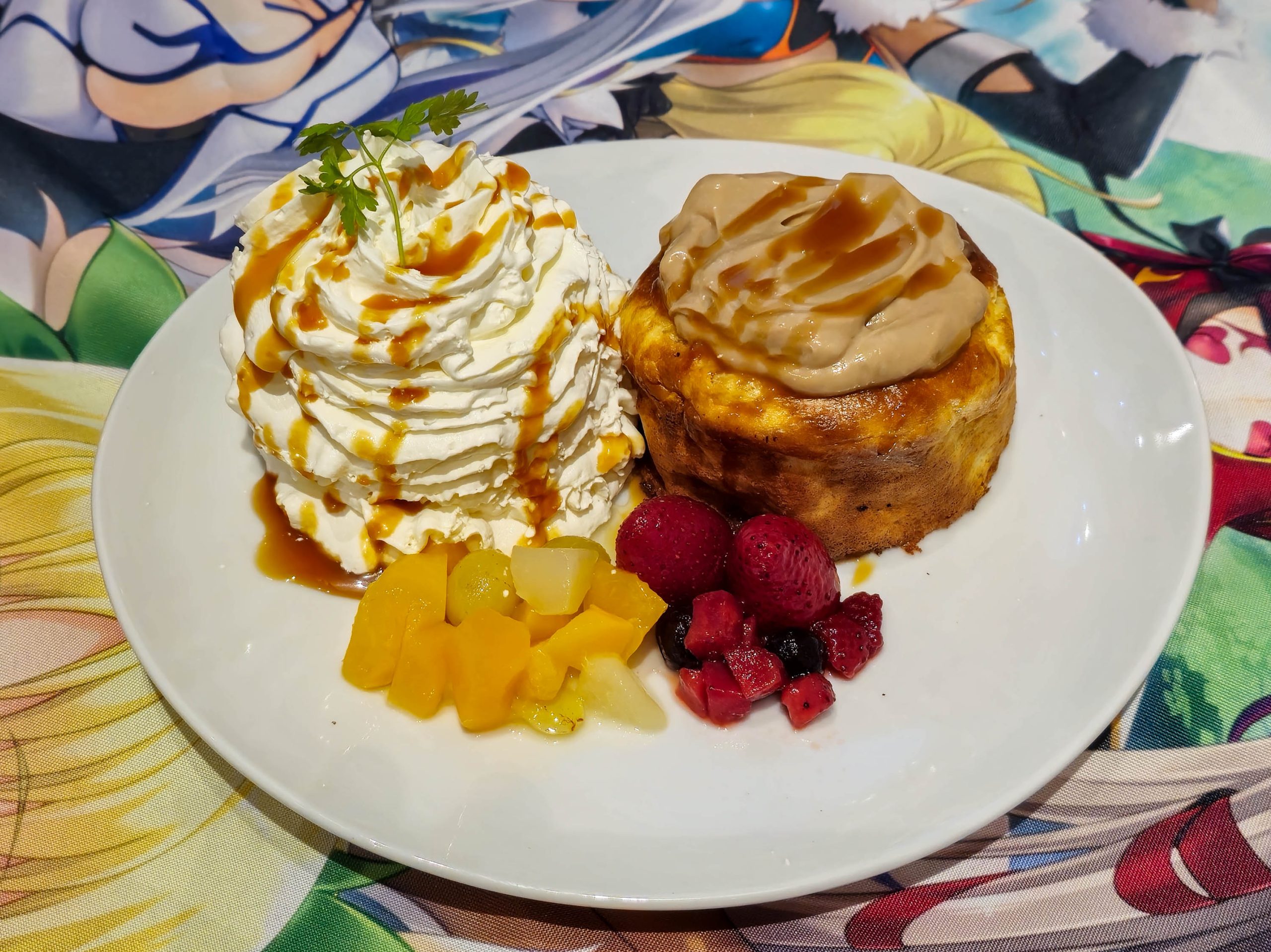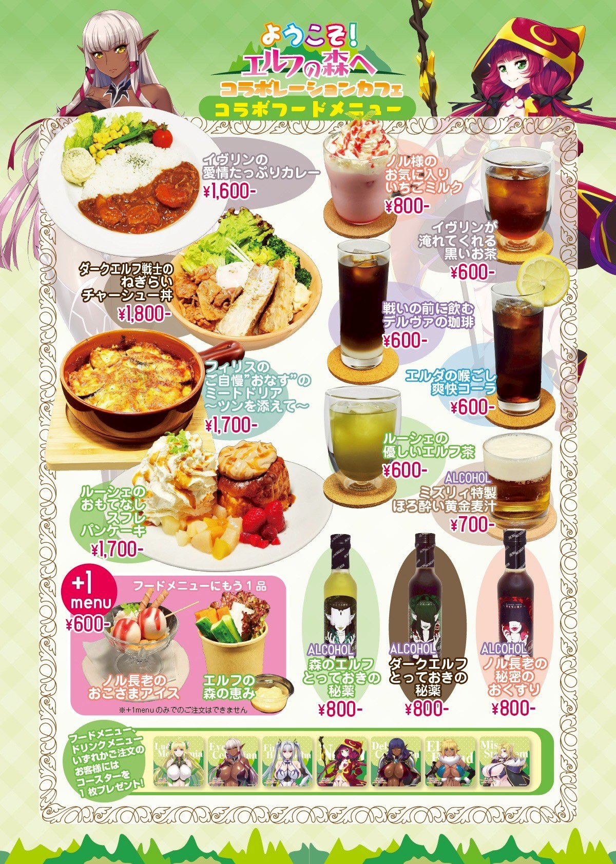 The special collab menu pulls inspiration straight from the characters and includes: Evelyn’s Love-filled curry for 1,600 yen ($11.15 USD), Dark Elf Warrior’s char siu donburi for 1,800 yen ($12.54 USD), Firis’ Pride and Joy meat doria with tsukudani for 1,700 yen ($11.84 USD), Lucie’s hospitality soufflé pancakes for 1,700 yen ($11.84 USD). The +1 menu includes Elder Nol’s Kids’ Ice Cream for 600 yen ($4.18 USD) and the Blessings of the Elven Forest for 600 yen ($4.18 USD).